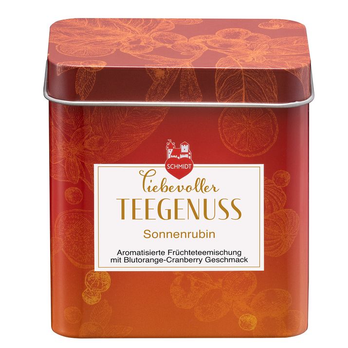 Mmmmh, dieser Duft nach Blutorange und Cranberries ... Diese unglaubliche Farbe, die an funkelnde Rubine erinnert ... Und dieser fruchtige, köstliche Geschmack von perfekt aufeinander abgestimmten Zutaten ... Das ist Sonnenrubin, ein loser Tee der Marke Liebevoller Teegenuss von Schmidt. Diese Teesorte haben wir speziell für den Lebkuchen des Jahres 2023 kreiert, die Südliche Elise, bei der sizilianische Orangen, Mandeln, feine Gewürze und so manche Geheimzutat für eine Geschmacksexplosion sorgen.