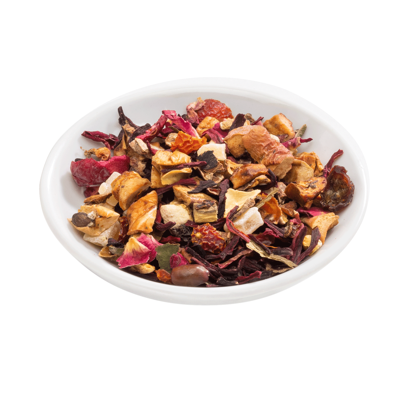 | Zutaten | Hibiskusblüten, Apfelstücke, Johannisbrotstücke, Orangenschalen 7%, Hagebuttenschalen, gezuckerte Papayastücke 4%(Papaya 2%, Zucker), Aroma, Schwarzer Pfeffer, Süßholzwurzel, Zichorienwurzel, süße Brombeerblätter, Rosenblütenblätter, Saflorblütenblätter, Cranberryscheiben 0,5%. |