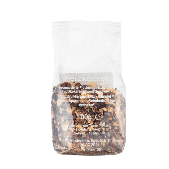 Der Duft beim Aufgießen verheißt hervorragenden, fruchtigen Genuss: Der Herzwärmer Tee aus unserer Kollektion ist eine einzigartige Komposition aus Früchten und Kräutern, verfeinert mit Karamellstückchen. Apfelstücke, Hibiskusblüten, Papaya, Ananas und Roiboos haben den Weg in diese Früchtetee-Mischung gefunden, und noch viele andere mehr!