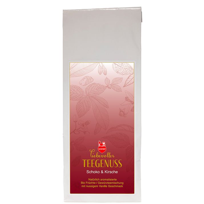 Schokolade und Kirschen sind seit jeher eine wunderbare Geschmackskombination. Unter der Marke Liebevoller Teegenuss haben wir die beiden zu einem köstlichen losen Tee verbunden, und zwar in Bio-Qualität. Erlesene Früchte und feine Gewürze machen diese Teemischung einzigartig in Aroma, Duft und Geschmack, ein Verwöhntee nicht nur für den Winter.
