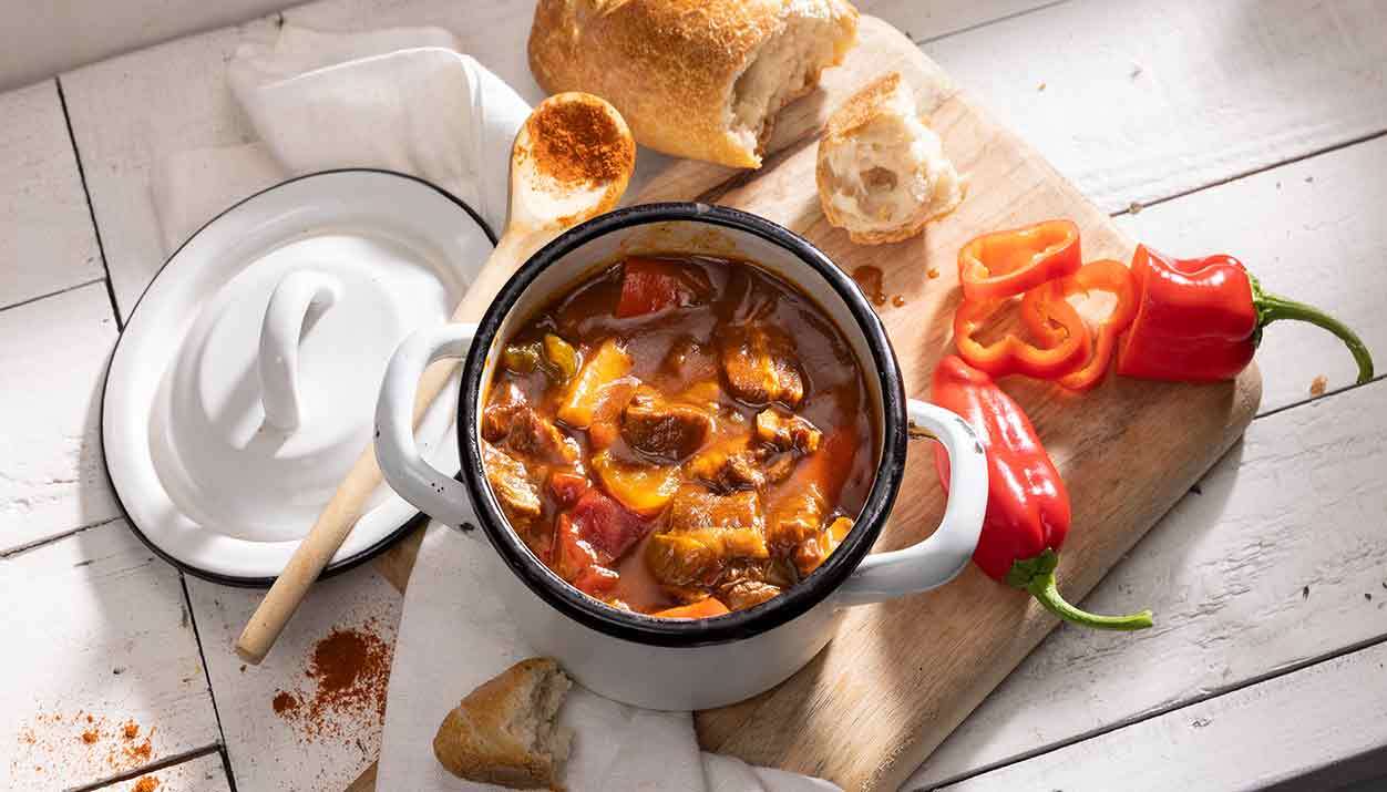 Schaschlik stammt aus den südosteuropäischen Ländern, wo feine Fleischstücke auf Spießen gegrillt und mit Soßen oder Dips serviert werden. Vor allem aus Ungarn kennen wir Schaschlik mit Paprika, und genau diese Kombination, die schon seit sehr langer Zeit bei uns besonders beliebt ist, hat den Weg in unseren Eintopf gefunden.