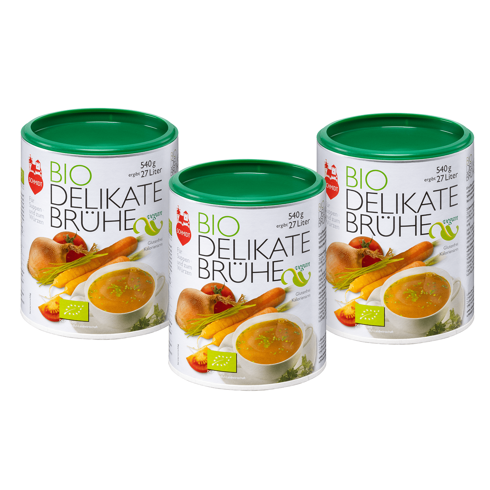 Ganz besonders gilt dies für unsere Gemüsebrühe in Bio-Qualität. Diese klare Instantbrühe in den großen Vorratsdosen kommt gänzlich ohne Geschmacksverstärker, Gluten und Farbstoffe aus, ist natürlich rein pflanzlich und vegan. Die hochwertigen Zutaten für die Brühe kaufen wir ausschießlich bei zertifizierten Bio-Lieferanten ein, um Ihnen beste Bio-Qualität garantieren zu können.