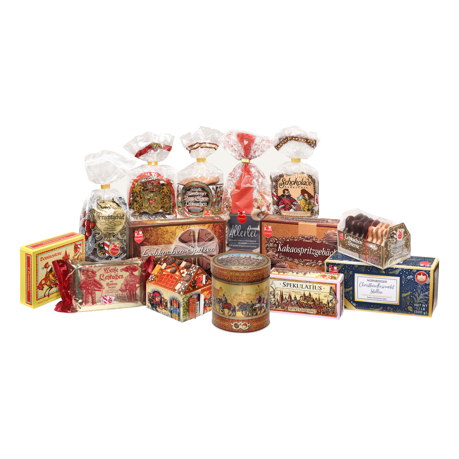 Ganz viele Nürnberger Lebkuchen-Spezialitäten haben wir hineingepackt, von den Original Nürnberger Nuss-Elisen-Lebkuchen über leckere Lebkuchensterne und knusprigen Spekulatius bis zum Allerlei, Christkindlesmarktstollen und köstlichem Kakaospritzgebäck.