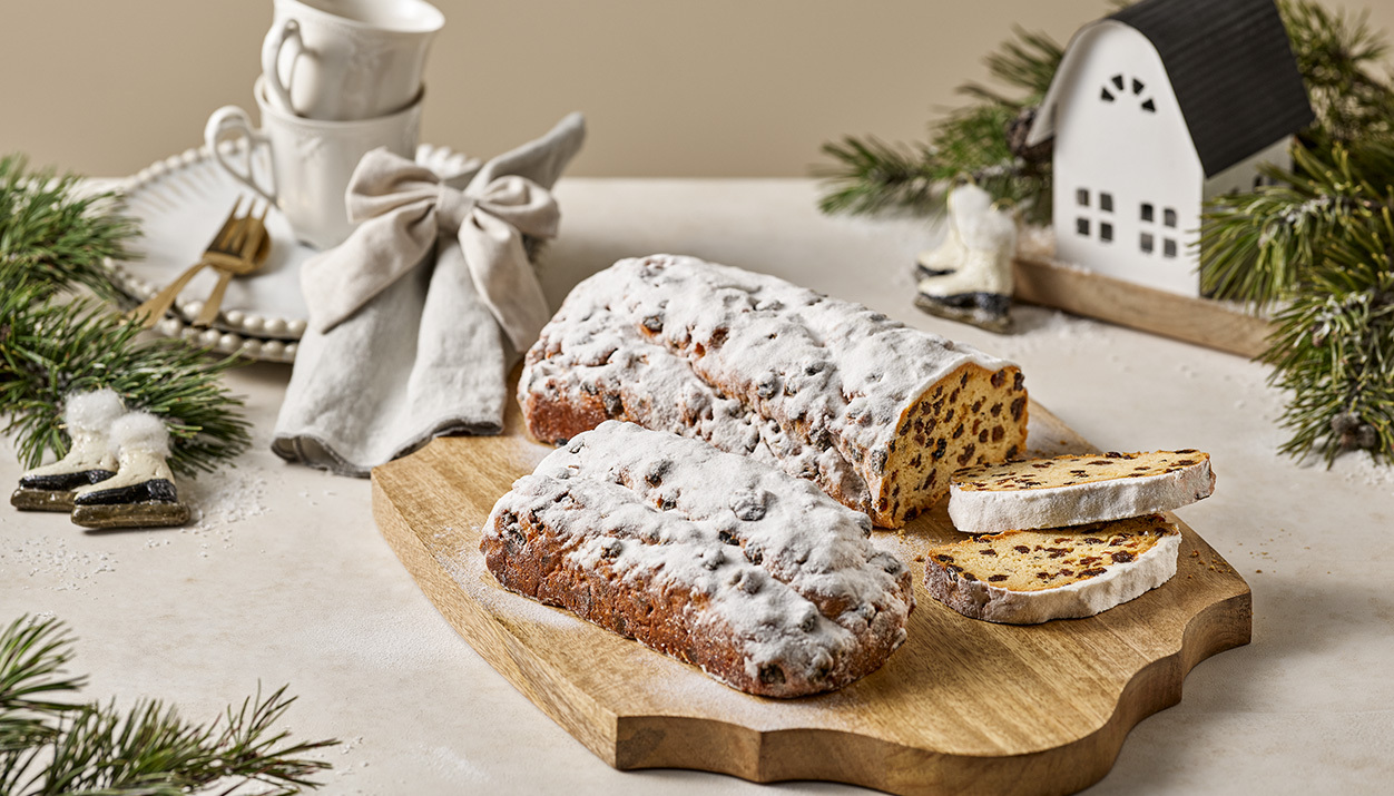Ein kleiner Einblick in die hochwertigen Zutaten: Der Weihnachtsstollen besteht aus feinem Hefeteig, angereichert mit einer geheimen Mischung aus edlen Gewürzen, Nüssen, saftigen Rosinen und zartem Marzipan, das im Teig verarbeitet ist. Traditionell hat das weihnachtliche Gebäck die Form des in Windeln gewickelten Jesuskindes und ist großzügig mit Puderzucker bestreut, der die Windeln symbolisiert.