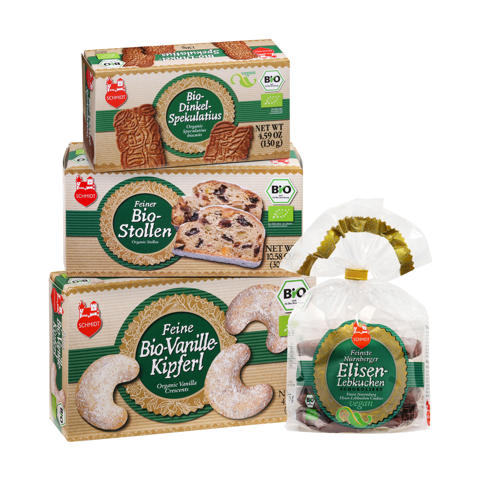 In hervorragender Bioqualität gibt es bei Lebkuchen Schmidt Christstollen, vegane Dinkel-Spekulatius, Vanillekipferl und schokolierte Elisen-Lebkuchen. Diese sind sogar vegan – und damit für wirklich jede Naschkatze geeignet!