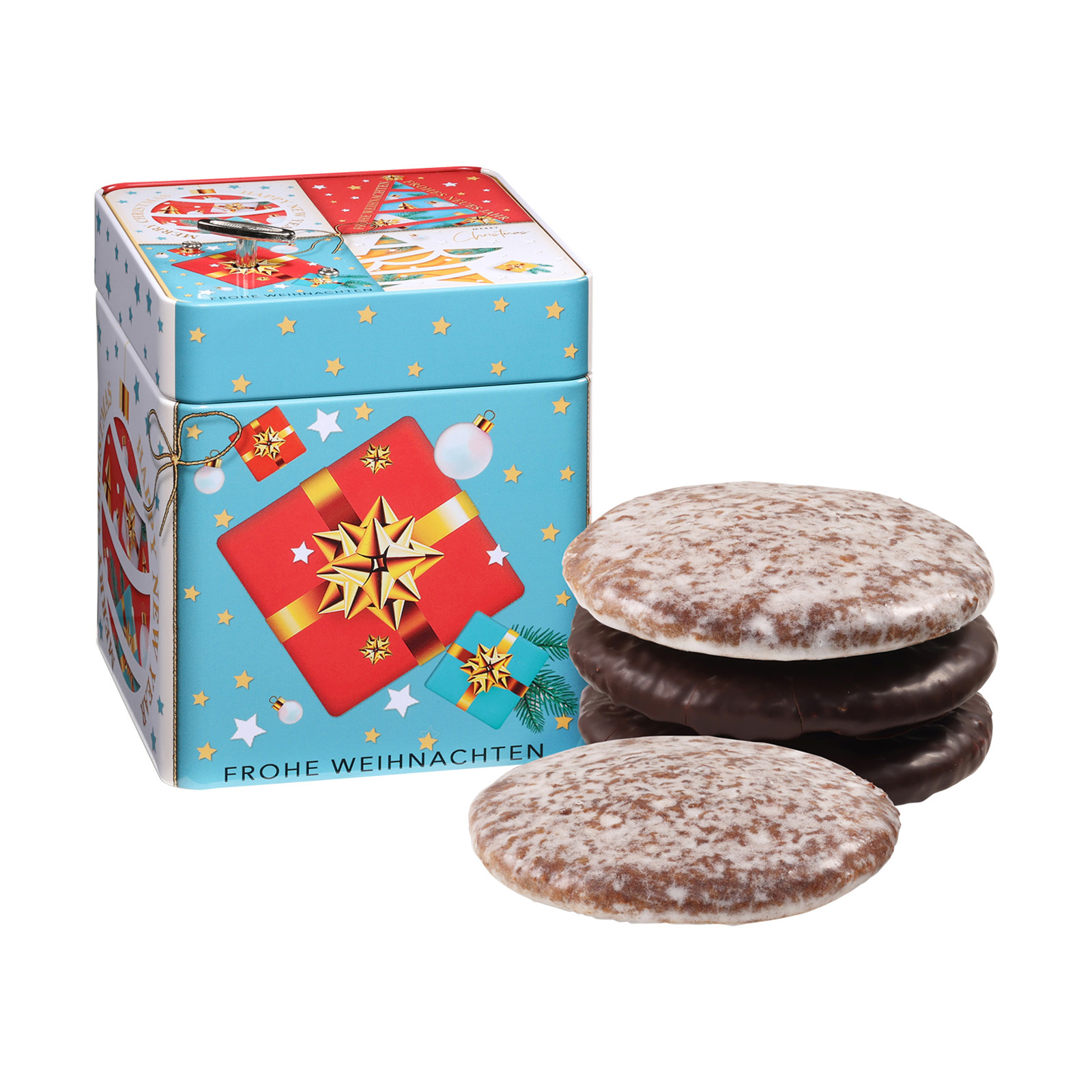 Kann es in der Weihnachtszeit etwas Schöneres geben, als saftige Lebkuchen zu genießen, während man den Klängen von „We wish you a merry christmas“ lauscht? Kann es fast nicht. Deshalb haben wir als besondere Geschenkidee die Spieluhr-Dose kreiert, die das beliebte Weihnachtslied spielt und auch passend gestaltet wurde: bunt und fröhlich wie die Stimmung, die das Lied versprüht. Innen drin finden sich vier exquisite Oblaten-Lebkuchen – schokoliert und glasiert – für feinsten Genuss unterm Weihnachtsbaum.