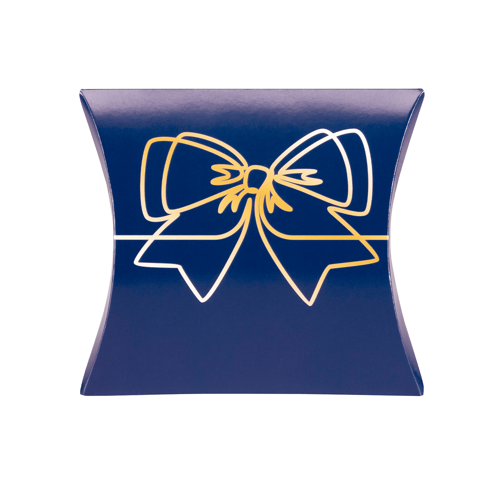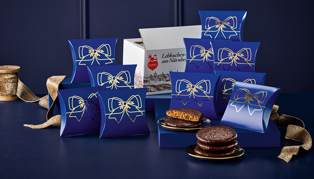 Wie wäre es zum Beispiel mit unseren weihnachtlichen Werbekissen? Auf dem Karton in Kissenform ist eine stilisierte Schleife aus filigranen, weiß-goldenen Linien auf nachtblauem Untergrund abgebildet. Innen befindet sich ein feinster schokolierter Nürnberger Elisen-Lebkuchen, das Beste, was unsere Lebkuchen-Backstube zu bieten hat.