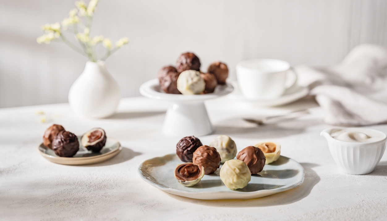 Dieses Geschmackserlebnis für alle Sinne bieten nur feinste Trüffel-Pralinen: Zuerst knackt die Schokolade herrlich frisch, und dann kommt die cremige Füllung und überrascht mit exquisiten Geschmacksrichtungen.