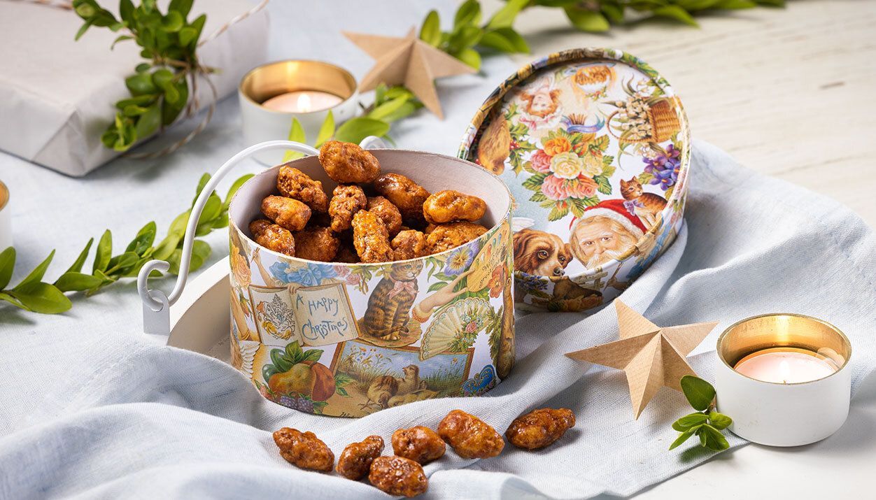 Diese Kindheitserinnerungen haben wir in eine wunderschöne Dose mit nostalgisch-romantischen Gefühlen gelegt. Und zwar in Form von köstlichen gebrannten Mandeln, die nach der Zubereitung frisch verpackt werden. So steigt Ihnen nach dem Öffnen der Dose der unvergessliche Duft direkt in die Nase. Und dann nehmen Sie eine Mandeln, beißen hinein, und: Ja, da ist er, der unvergleichliche süß-knackige Geschmack von karamellisiertem Zucker und der köstlichen Mandel!