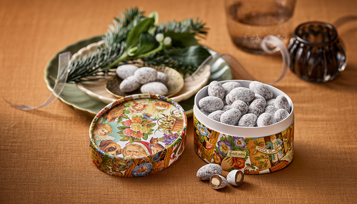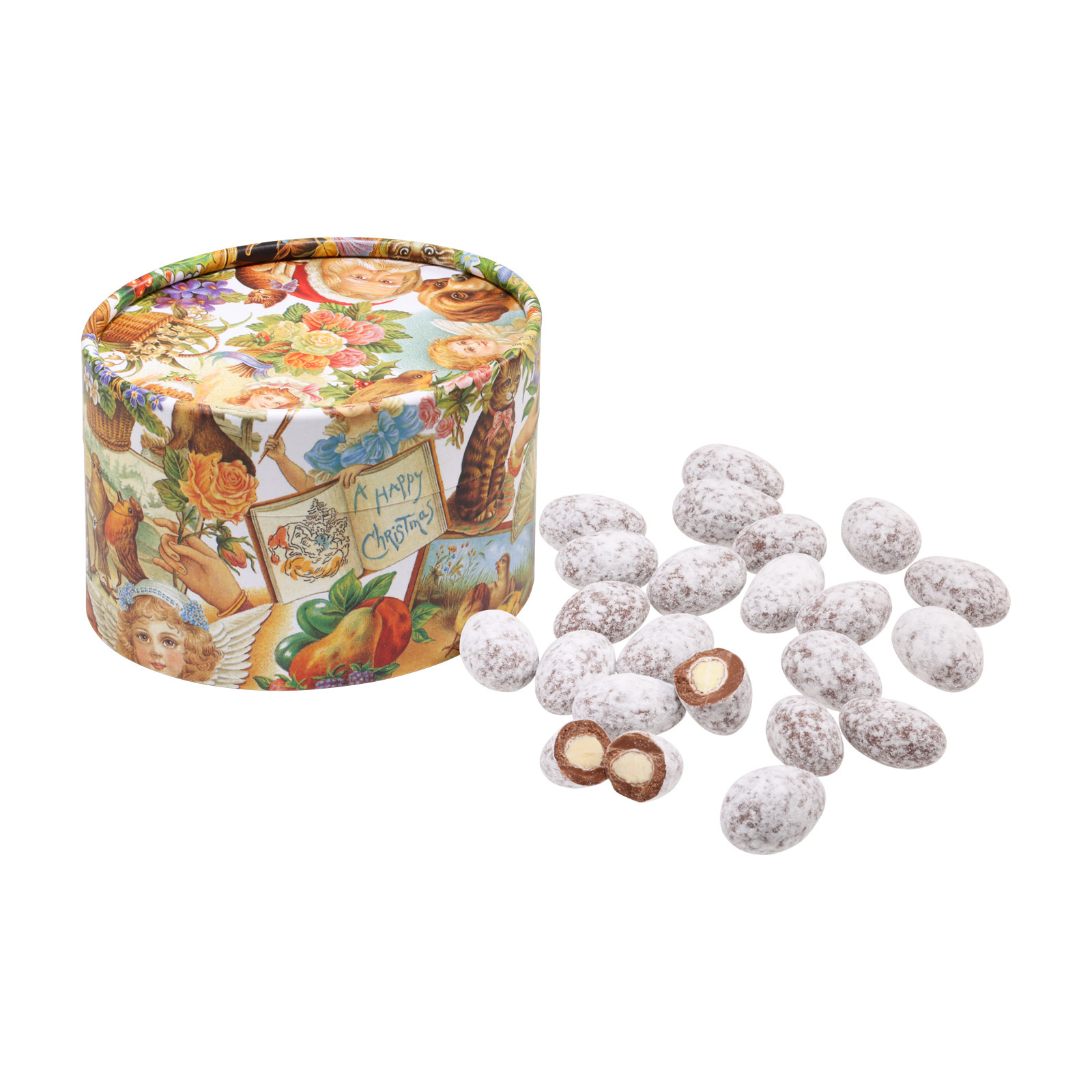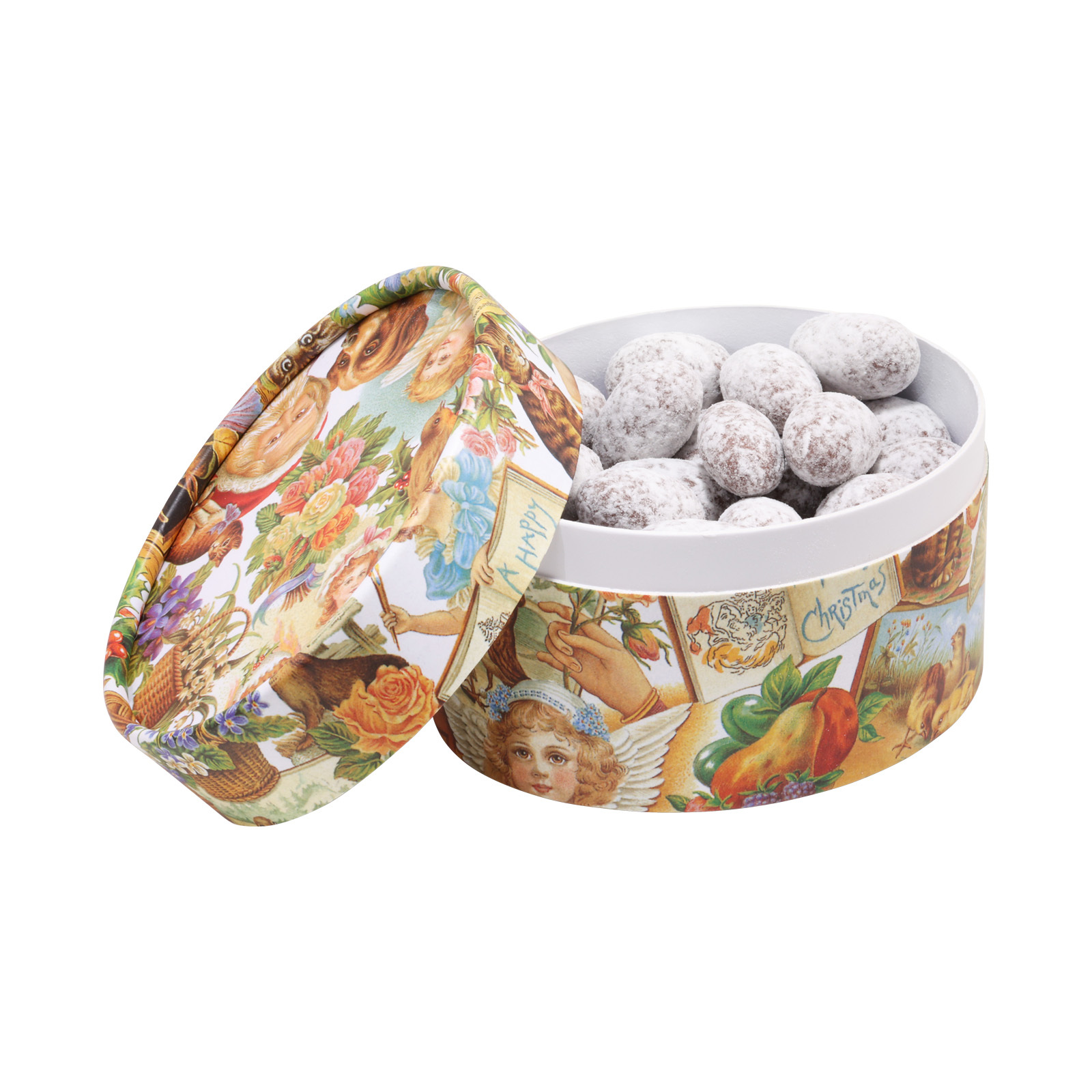 Solch süße Spezialitäten brauchen eine ebenso süße Verpackung. Deshalb kommen die Schneebälle in einer ovalen Dose heran, die mit niedlichen, romantischen Motiven von Bildern aus den 20er Jahren des letzten Jahrhunderts verziert sind. Da sind Kätzchen und Rosen, Weihnachtsmänner und Engel zu sehen, in warmen Goldtönen gehalten und einfach nur unsagbar niedlich.