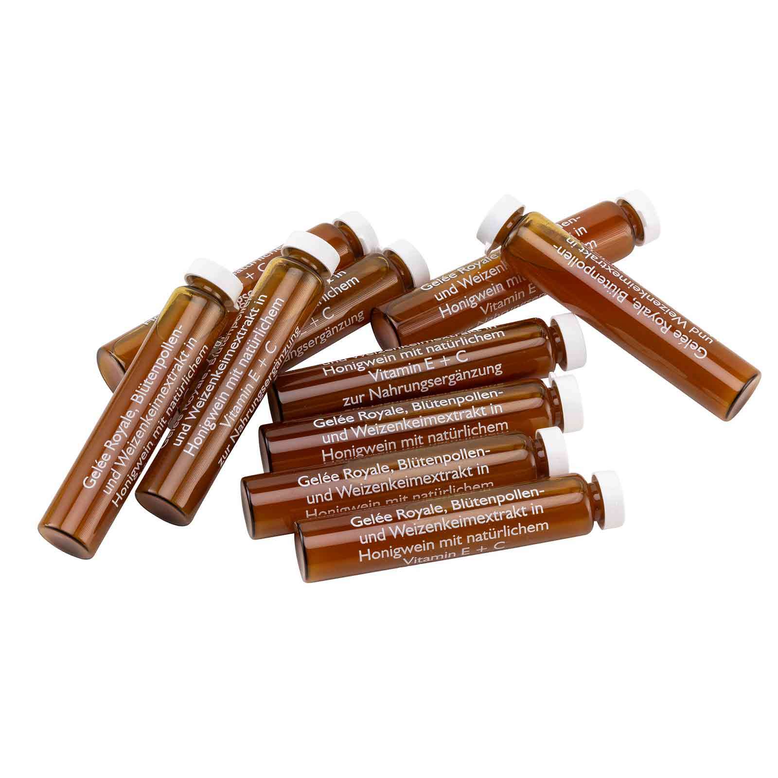 Im Einzelfall kann es vorkommen, dass nach dem Erscheinen dieser Produktinformation inhaltliche Änderungen erfolgt sind. Aus diesem Grund bitten wir Sie, vor dem Verzehr unserer Produkte die Zutatenliste und die Nährwertangaben auf der jeweiligen Verpackung zu beachten. Gelée royale, Propolis-, Blütenpollen- und Weizenkeimextrakt in Honigwein; Nahrungsergänzungsmittel mit natürlichem Vitamin C + E