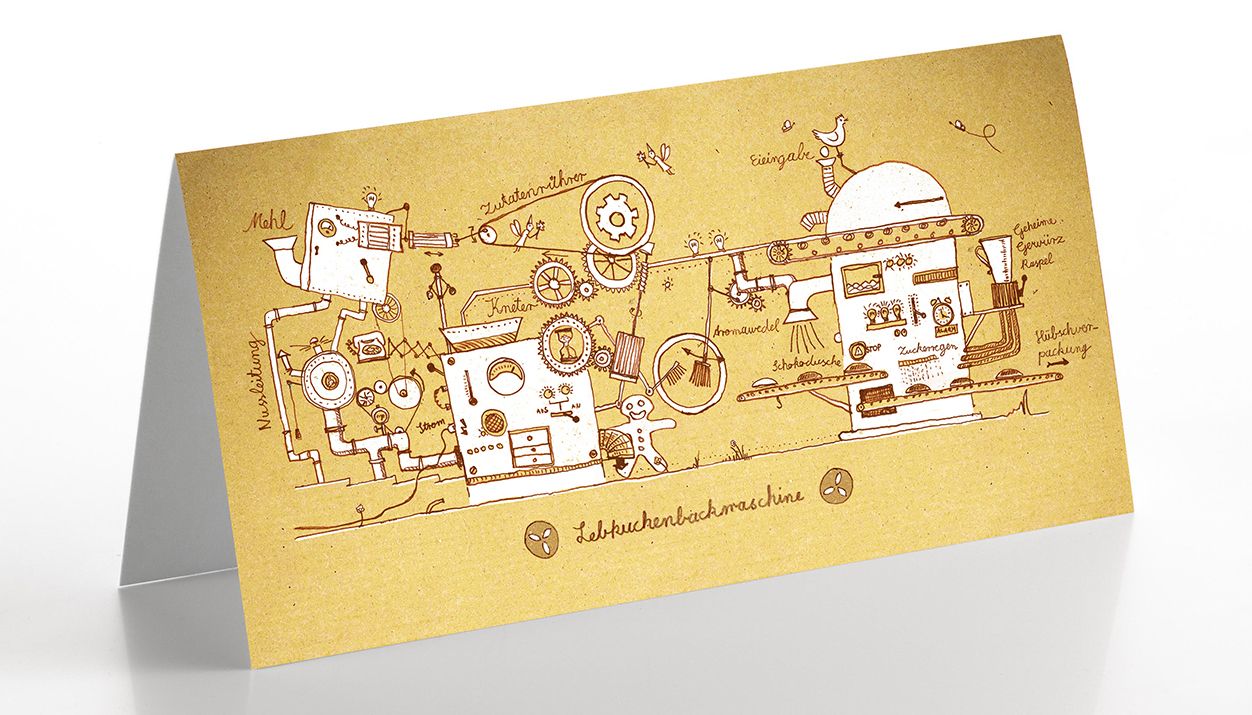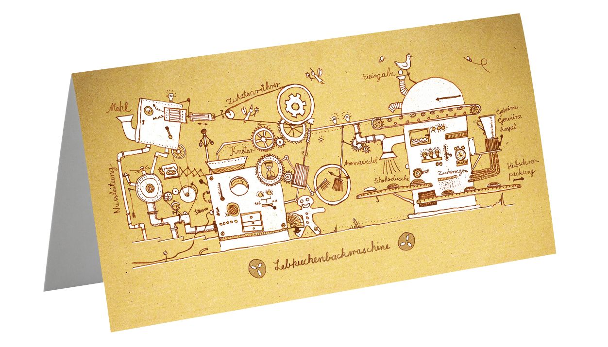 Wenn Sie Freunde oder Verwandte haben, die schon immer wissen wollten, wie Lebkuchen hergestellt werden, dann haben wir die perfekte Weihnachtskarte für Sie: eine detaillerte Darstellung einer Lebkuchenbackmaschine. Zugegeben, sie ist mit einem Augenzwinkern gedacht, aber dennoch macht es Freude, die einzigartige Zeichnung zu betrachten und immer wieder Neues zu entdecken.