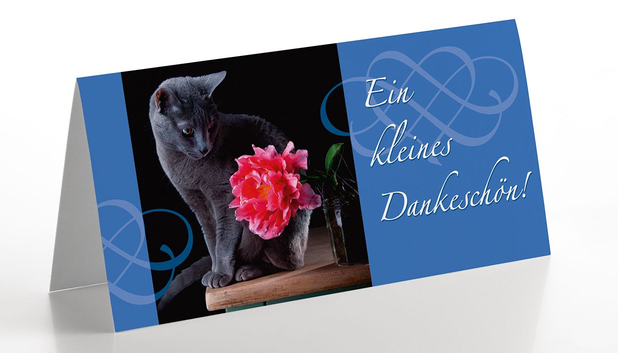 Auf unserer Karte miaut für Sie eine niedliche Katze das "Dankeschön". Und wir sind der Meinung: Schwarze Katzen bringen nicht Pech, sondern Leckereien mit sich!