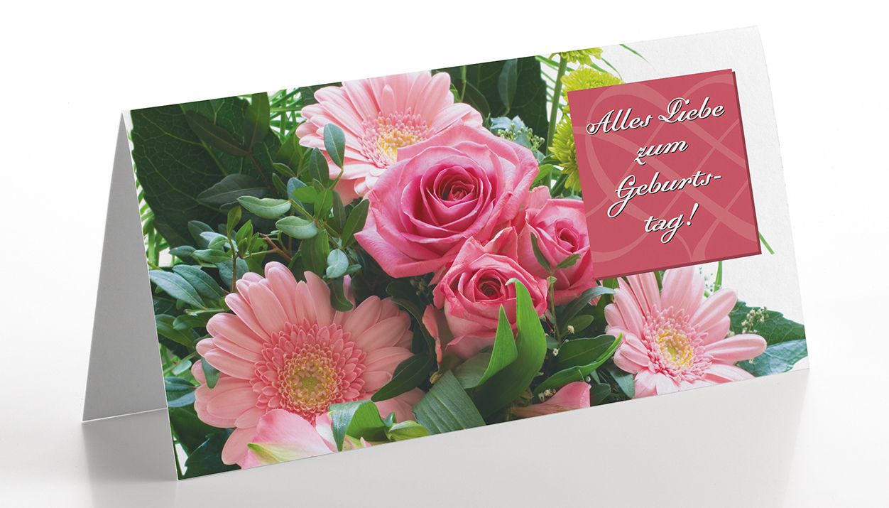 Entscheiden Sie sich hier für eine in rosa gehaltene Geburtstagskarte mit Rosen und Gerbera und der Aufschrift "Alles Liebe zum Geburtstag".