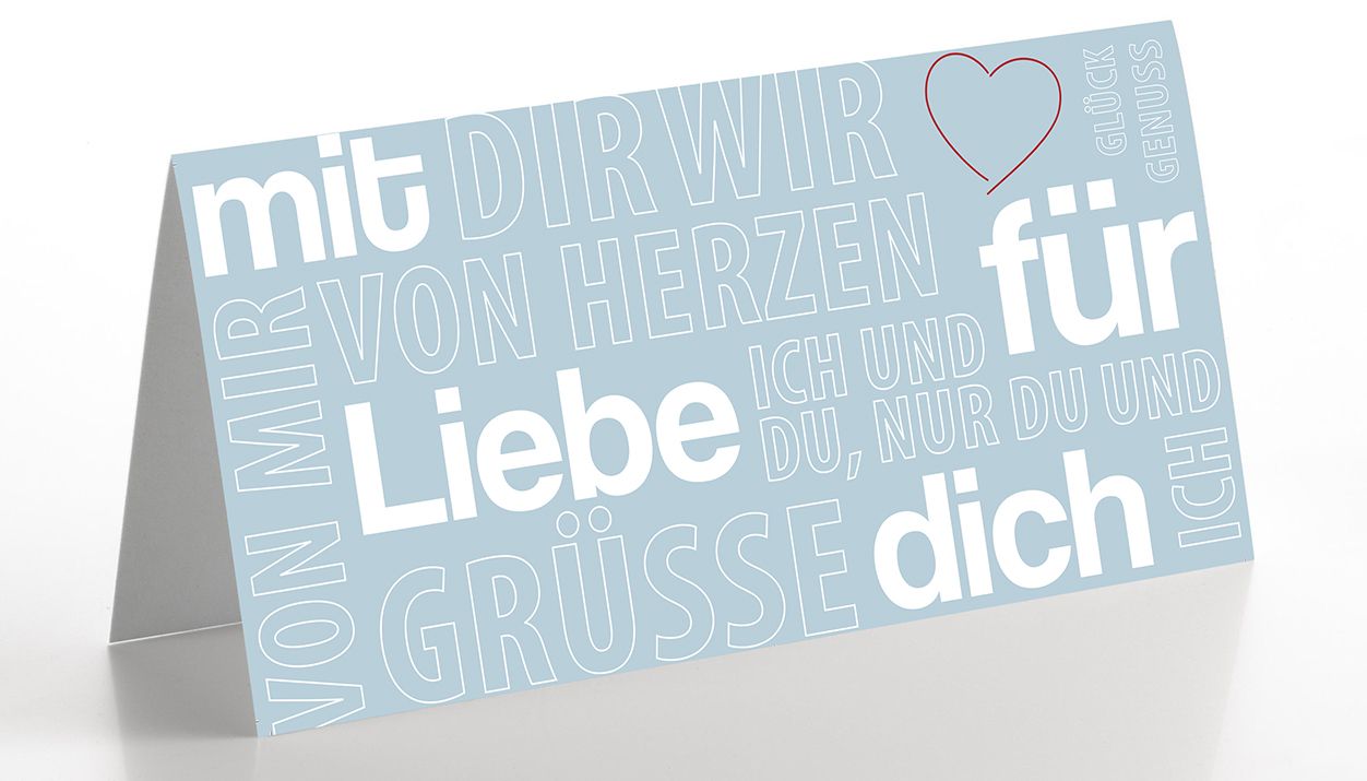 Für diesen Fall ist unsere Grußkarte "Aus Liebe" optimal geeignet. Modern typographisch gestaltet, finden sich vorne verschiedene Aussagen wie "Mit Liebe für dich" oder "Ich und du". Dank der ausgeklügelten Anordnung kann man die Worte immer wieder in unterschiedlichen Konstellationen lesen und so immer wieder neue Grüße entdecken. Vor allem für Fernbeziehungen sind kleine (oder auch große), per Post überbrachte Geschenke ein Trost in der Zeit der Trennung.