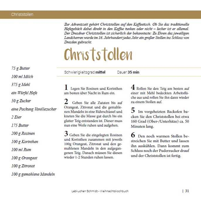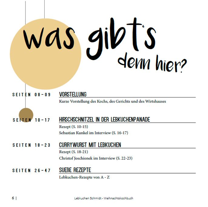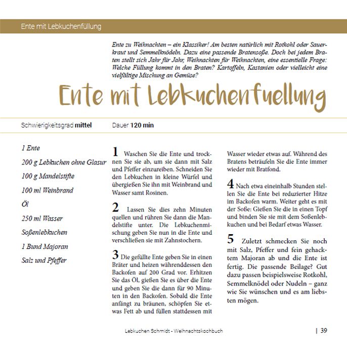 In unserem Lebkuchen Schmidt-E-Book finden Sie einige der leckersten Plätzchen- und Lebkuchen-Rezepte aus unserer Weihnachtswelt und fantastische Ideen für Festtagsrezepte – vom klassischen Entenbraten bis zur modern-aufwendigen Currywurst. Für zwei dieser Rezepte haben wir wieder mit fränkischen Profi-Köchen zusammengearbeitet, die uns nicht nur mit ihrem Essen begeisterten, sondern uns auch diverse Fragen beantwortet haben. Der Clou an unseren Festtagsrezepten: All die deftigen Sachen werden mit Lebkuchen gewürzt – so ist ein besonders einzigartiges Weihnachtsfest garantiert!