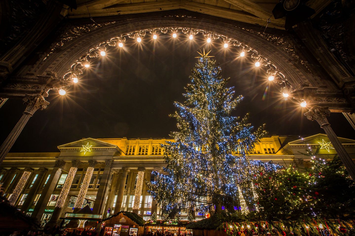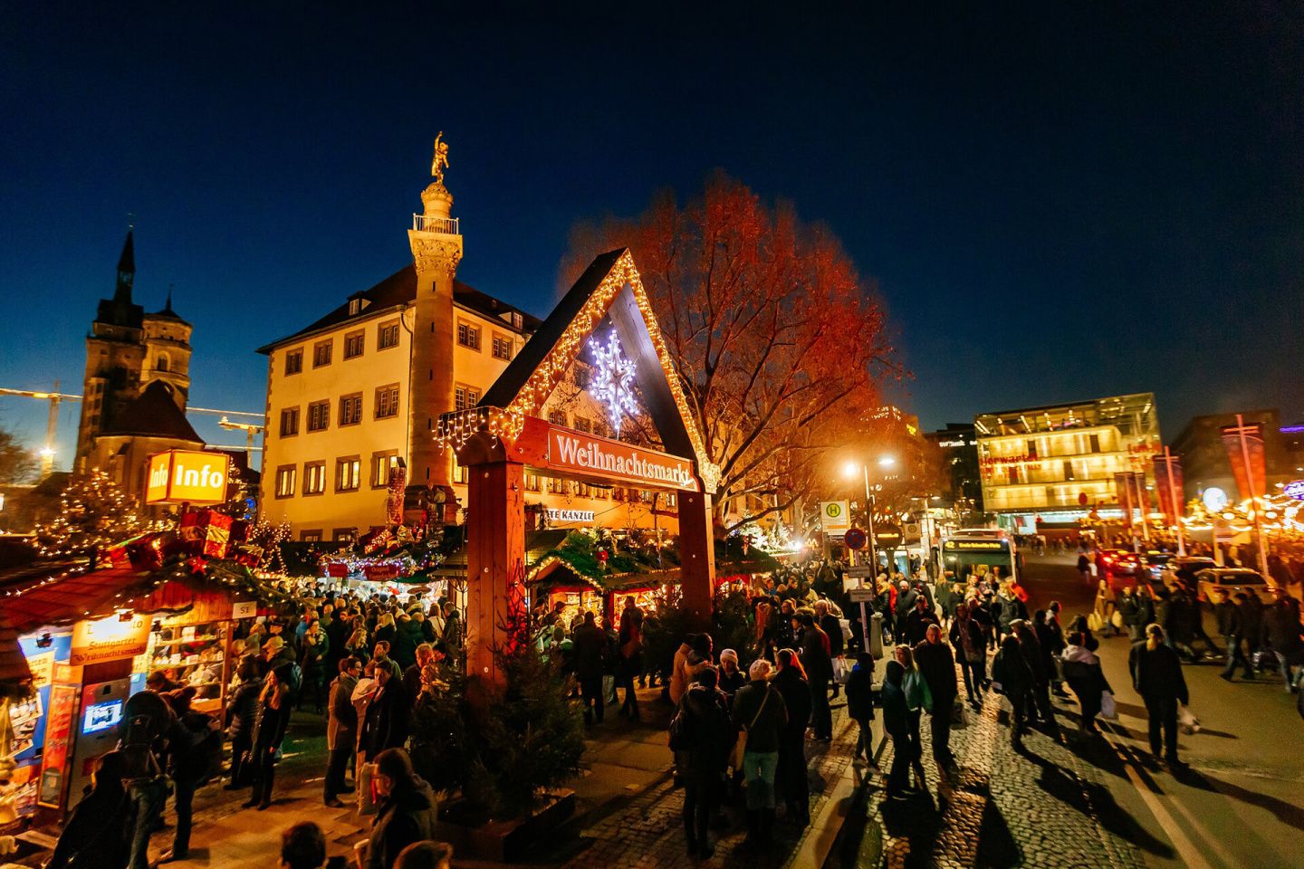 Der Stuttgarter Weihnachtsmarkt erstreckt sich vom Neuen Schloss und Königsbau über den Schillerplatz mit Altem Schloss und Stiftskirche bis zum Marktplatz.