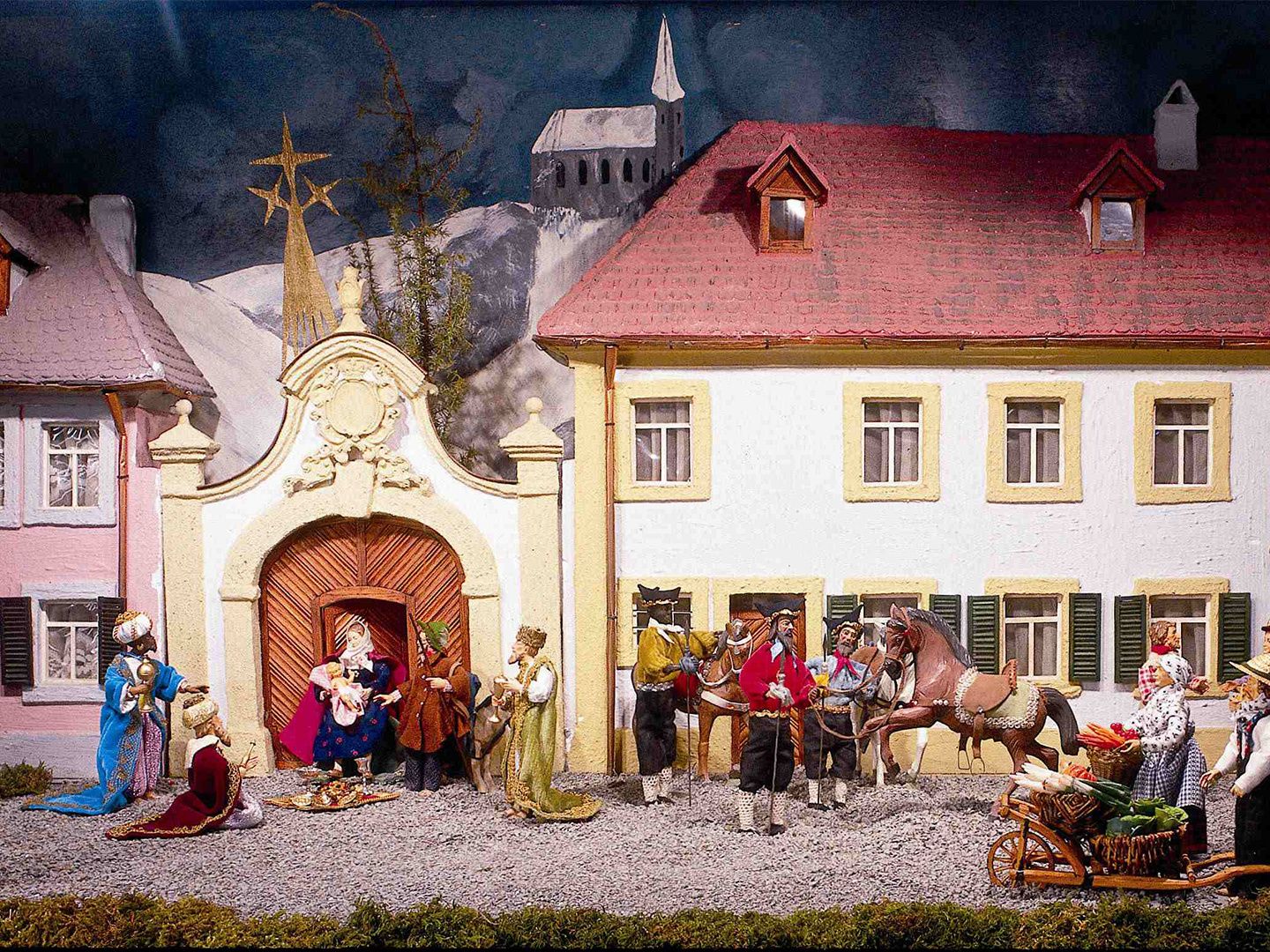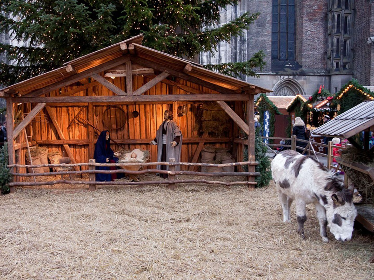 Joseph machte sich daher mit seiner hochschwangeren Verlobten Maria auf nach Betlehem, um sich zählen zu lassen. Und als sie dort ankamen, war auch schon die Zeit für Maria gekommen, ihr Kind zu gebären. Weil wegen der Volkszählung jedoch alle Herbergen belegt waren und das Paar keinen Platz fand, suchten sie Zuflucht in einem Stall.