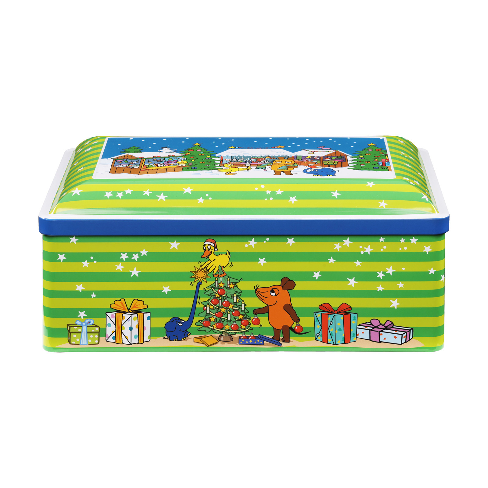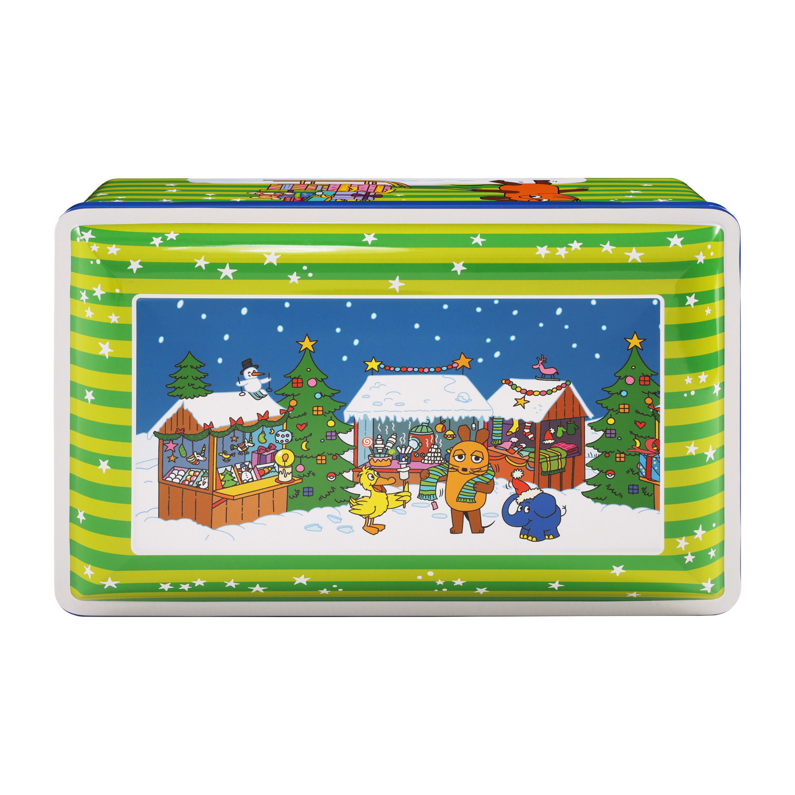 Auf unserer Kinder-Truhe zeigen wir die Maus und ihre Freunde – den Elefanten und die Ente –, wie sie gemeinsam Weihnachten feiern.
