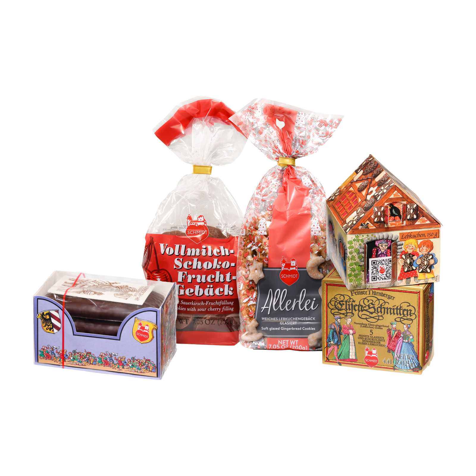 Im Inneren der Truhe sind allerlei weihnachtliche Schätze aus Nürnberg zu finden: feinste Elisen-Schnitten (schokoliert und glasiert), ein Lebkuchen-Märchenhaus, Fruchtgebäck mit Vollmilchschokolade oder auch glasiertes Allerlei: lauter weihnachtliche Spezialitäten, die Kinder besonders mögen.