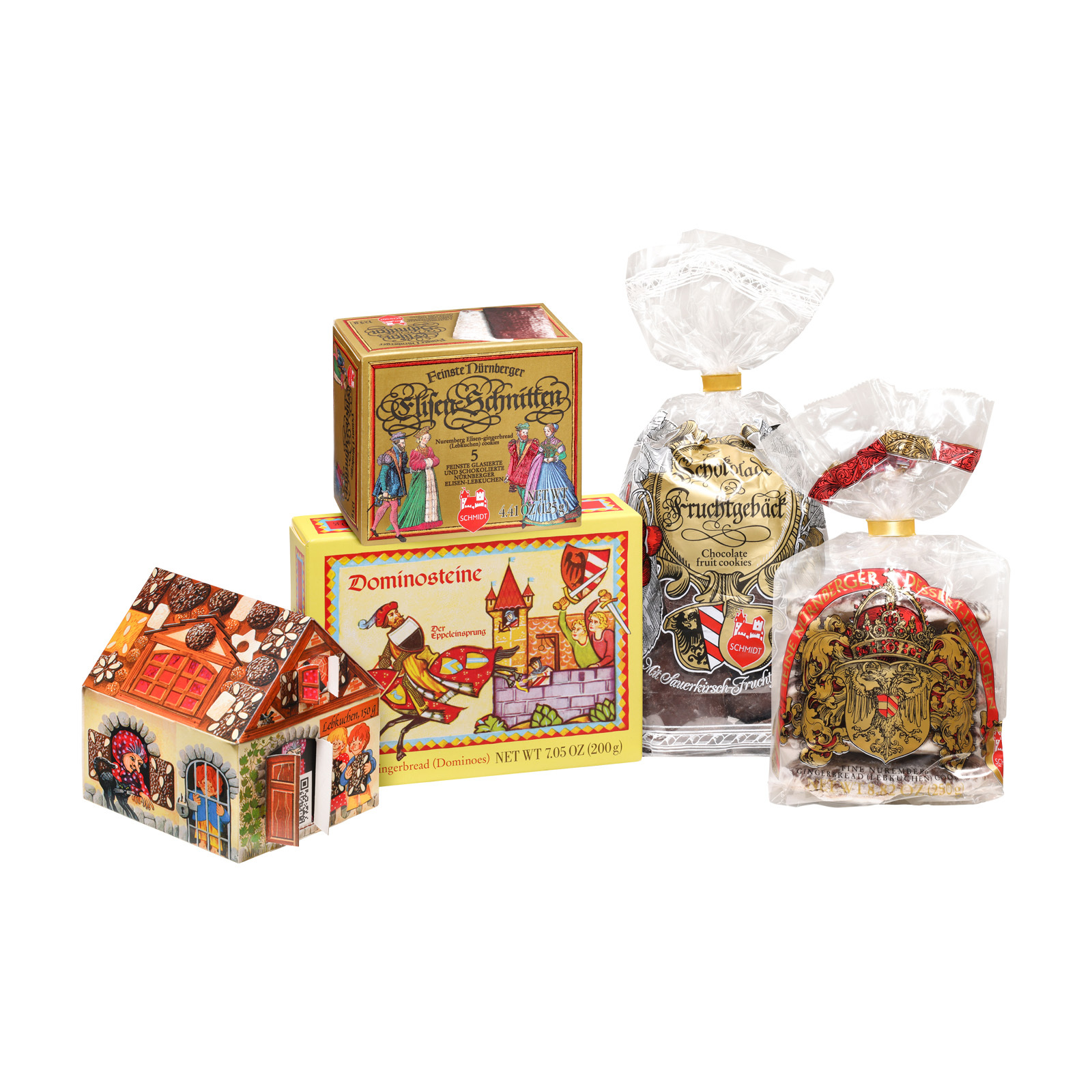Ein Blick unter den schönen Deckel verrät, dass es auch in der Truhe winterlich zugeht: Köstliche Elisen-Schnitten haben hier Platz gefunden, genauso wie Schokolade-Fruchtgebäck und für die Kinder ein niedliches Märchenhäuschen, das mit dem beiliegenden Märchen die Winterabende noch schöner macht und die Fantasie anregt.