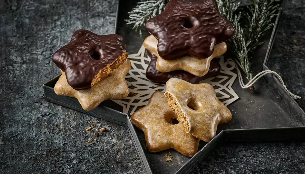 Wer's vielfältig mag, wird unsere Lebkuchensterne lieben! In dieser wunderbaren Kreation trifft die eine Hälfte der braunen Lebkuchen auf eine feine Orangenfruchtfüllung und Schokoladenüberzug und die andere Hälfte auf gemahlene Nüsse und Mandeln im Teig und eine leckere Zuckerglasur. Somit ist in unserer gemischten Packung für jeden etwas dabei! Der nussig-karamellige oder fruchtig-süße weich gebackene Teig zergeht geradezu im Mund: Das nennen wir einen wahren Gaumenschmauß!