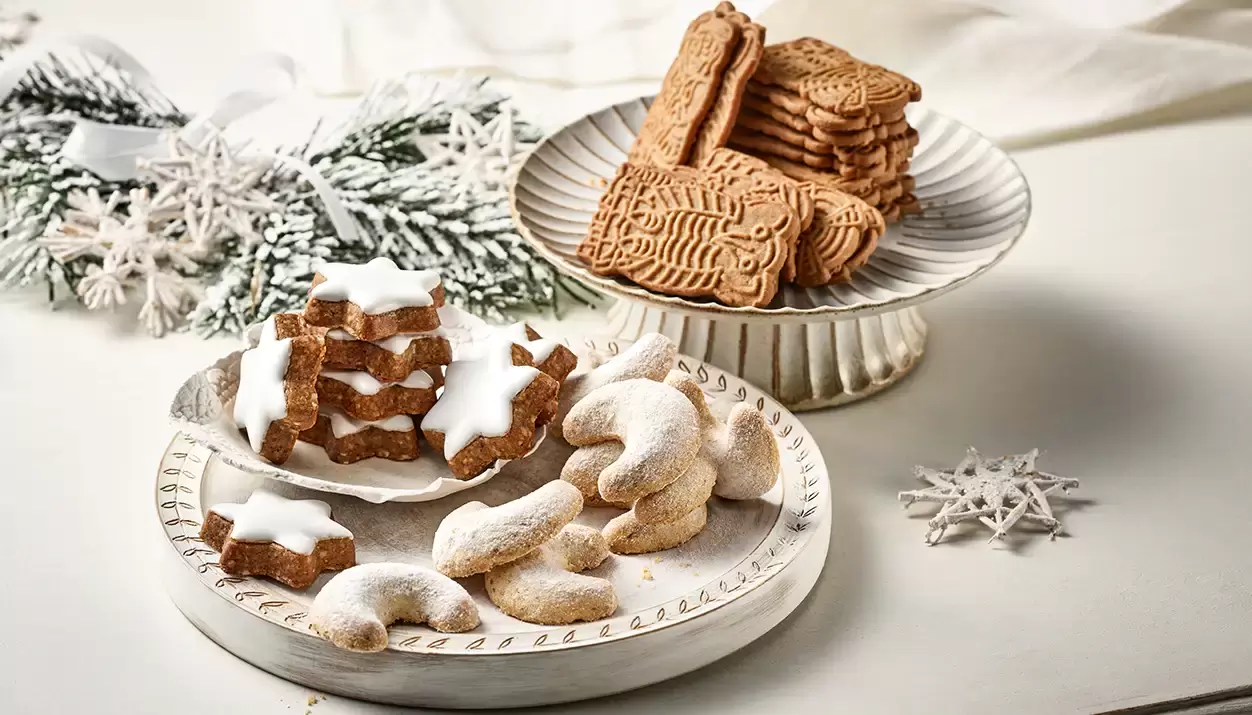 Die zarten Vanillekipferl zergehen förmlich auf der Zunge – herrlich mürbe und mit echter Bourbon-Vanille verfeinert. Unsere Zimtsterne duften intensiv nach weihnachtlichen Gewürzen und überzeugen mit saftigem Biss und einem Hauch von Mandeln. Und der Spekulatius darf auf keinen Fall fehlen: schön knusprig, fein gewürzt und unwiderstehlich im Geschmack – so wie man ihn aus Kindertagen kennt.