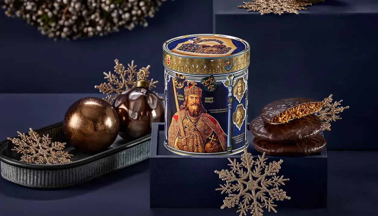 Selbstverständlich verdient die weihnachtliche Premium-Spezialität aus dem Hause Lebkuchen-Schmidt auch eine außergewöhnliche Verpackung. Deshalb haben wir für die Lebkuchen eine hochwertige Metalldose entwerfen lassen, die mit – wie sollte es anders sein – Kaisermotiven verziert ist: In Reihen sind die Kaiser vergangener Tage abgebildet und laden ein zum Entdecken außergewöhnlicher Kleidung und Accessoire. Auch nach dem Verzehr der Kaiser-Elisen ist die schöne Dose vielseitig einsetzbar, ob für selbstgebackene Plätzchen oder kleine Weihnachtsdeko-Artikel, die einen Aufbewahrungsort brauchen.