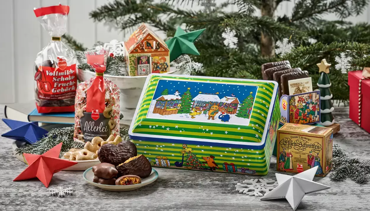 Im Inneren der Truhe sind allerlei weihnachtliche Schätze aus Nürnberg zu finden: feinste Elisen-Schnitten (schokoliert und glasiert), ein Lebkuchen-Märchenhaus, Fruchtgebäck mit Vollmilchschokolade oder auch glasiertes Allerlei: lauter weihnachtliche Spezialitäten, die Kinder besonders mögen.