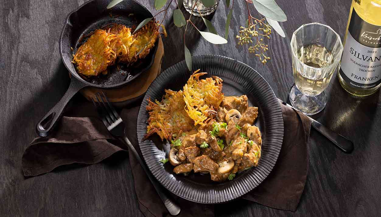 A classic of Swiss cuisine is Zürcher Geschnetzeltes. In Germany, the dish is so popular that it can hardly be missing in any middle-class restaurant. It was first mentioned in a cookbook in 1947. The recipe consisted of veal, cream, white wine and meat sauce - over the years it has been modified regionally, refined with mushrooms, some also add veal kidneys.